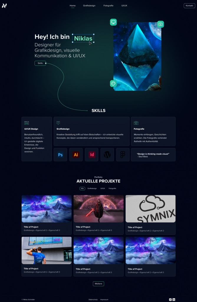 Im detaillierten Design wurde schließlich der Hero definiert und mit mehr Text als in der alten Webseite versehen, um direkt auf meine Rolle hinzuweisen. Das “Niklas” ist zudem in der Akzentfarbe und mit einer typischen Selection Box aus Figma oder Photoshop versehen, um Elemente aus den Programmen subtil einzubauen.