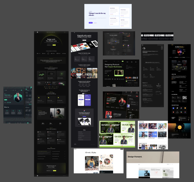 Im Moodboard habe ich zunächst online verschiedene Portfolio-Designs gesucht, die zu meiner Idee bzw. meiner Vorstellung passen. Es handelt sich dabei um eine Mischung aus sehr simplen UI/UX-Portfolios, die lediglich ihre Projekte schnell und ohne Schnickschnack darstellen, sowie optisch ansprechende Grafikdesign-Portfolios. Meine Vision stellteine Mischung aus beiden Ideen dar: Optisch ansprechend, aber schneller Zugang zu den wichtigen Informationen.